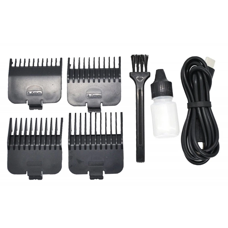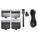 محتويات العلبة: فرشاة تنظيف، زيت شفرة، 4 أمشاط (1.5 مم، 3 مم، 4.5 مم، 6 مم)، شحن عبر منفذ USB.