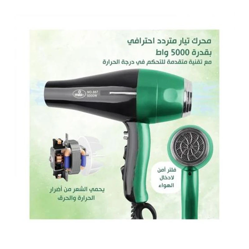 مجفف الشعر ماكس MA-887 بقوة 5000 واط هو أداة قوية وفعالة مصممة للاستخدام الاحترافي والمنزلي. بفضل قوته العالية، يضمن هذا المجفف تجفيف شعرك بسرعة وبشكل متساوٍ. يتميز موديل MA-887 بتكنولوجيا متقدمة توفر إعدادات متعددة للحرارة والسرعة، مما يتيح لك تخصيص تجربة التجفيف حسب نوع شعرك والتصفيفة التي ترغبين بها.