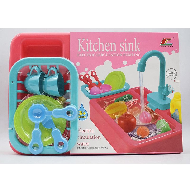 A toy kitchen sink with an electric water circulation system that mimics real-life washing experiences. Kids can have fun learning about cleaning up with this interactive play tool.
